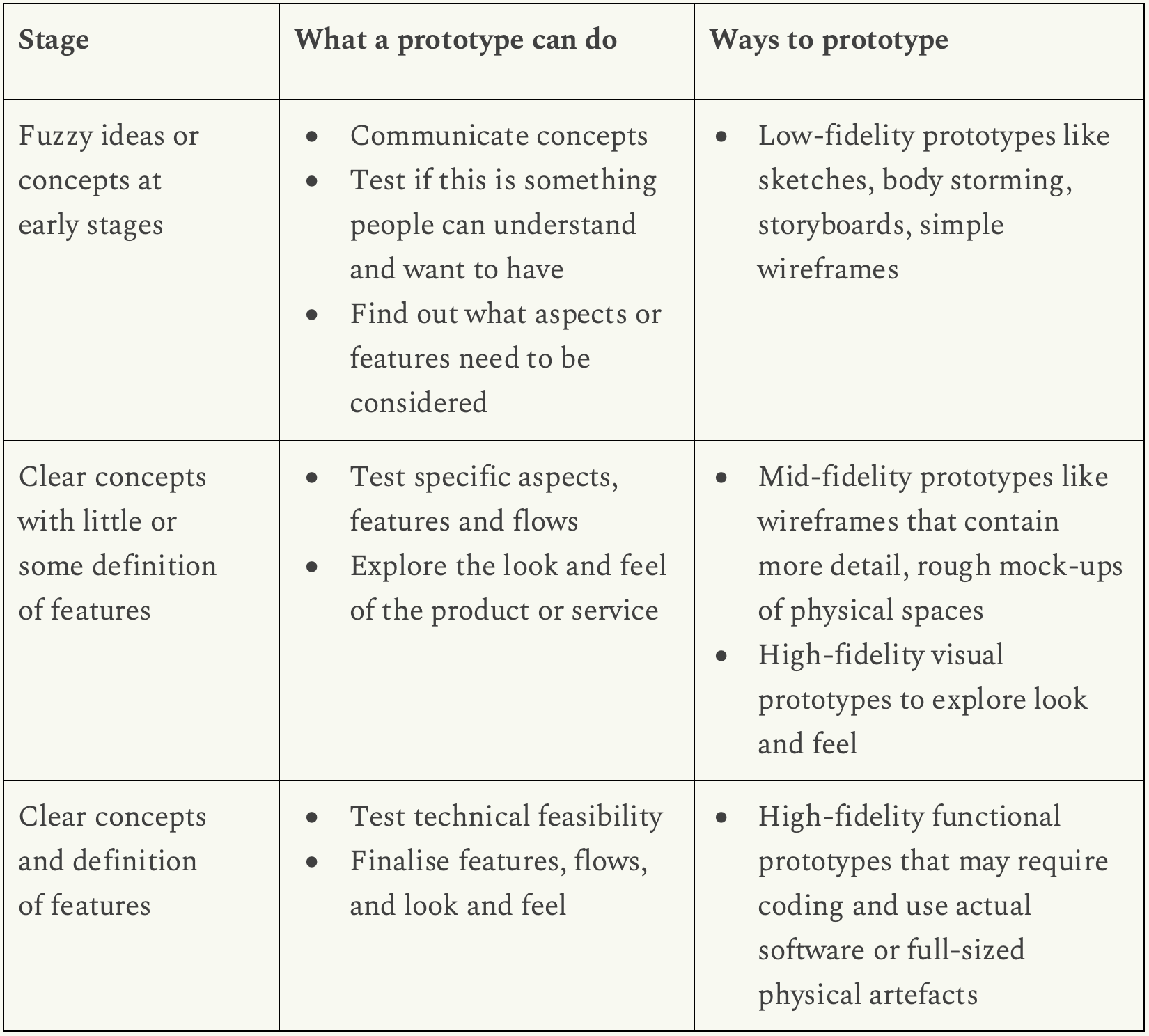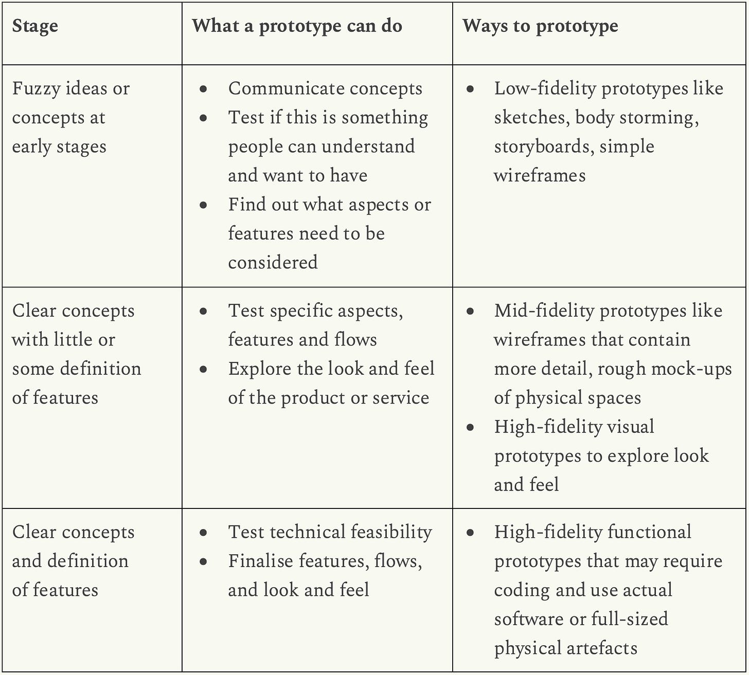 Prototyping can happen in any part of the design process and can be used as part of the designing the process itself e.g. testing your research or workshop activities before carrying them out.